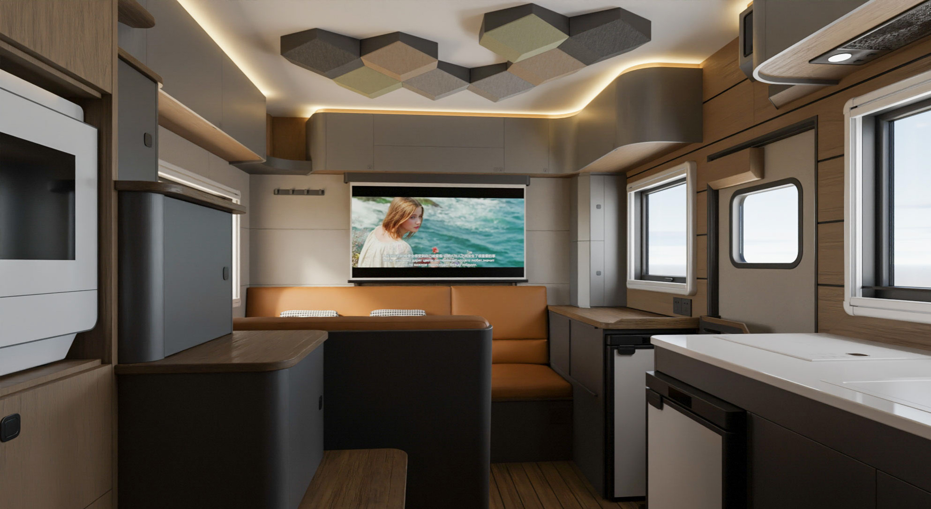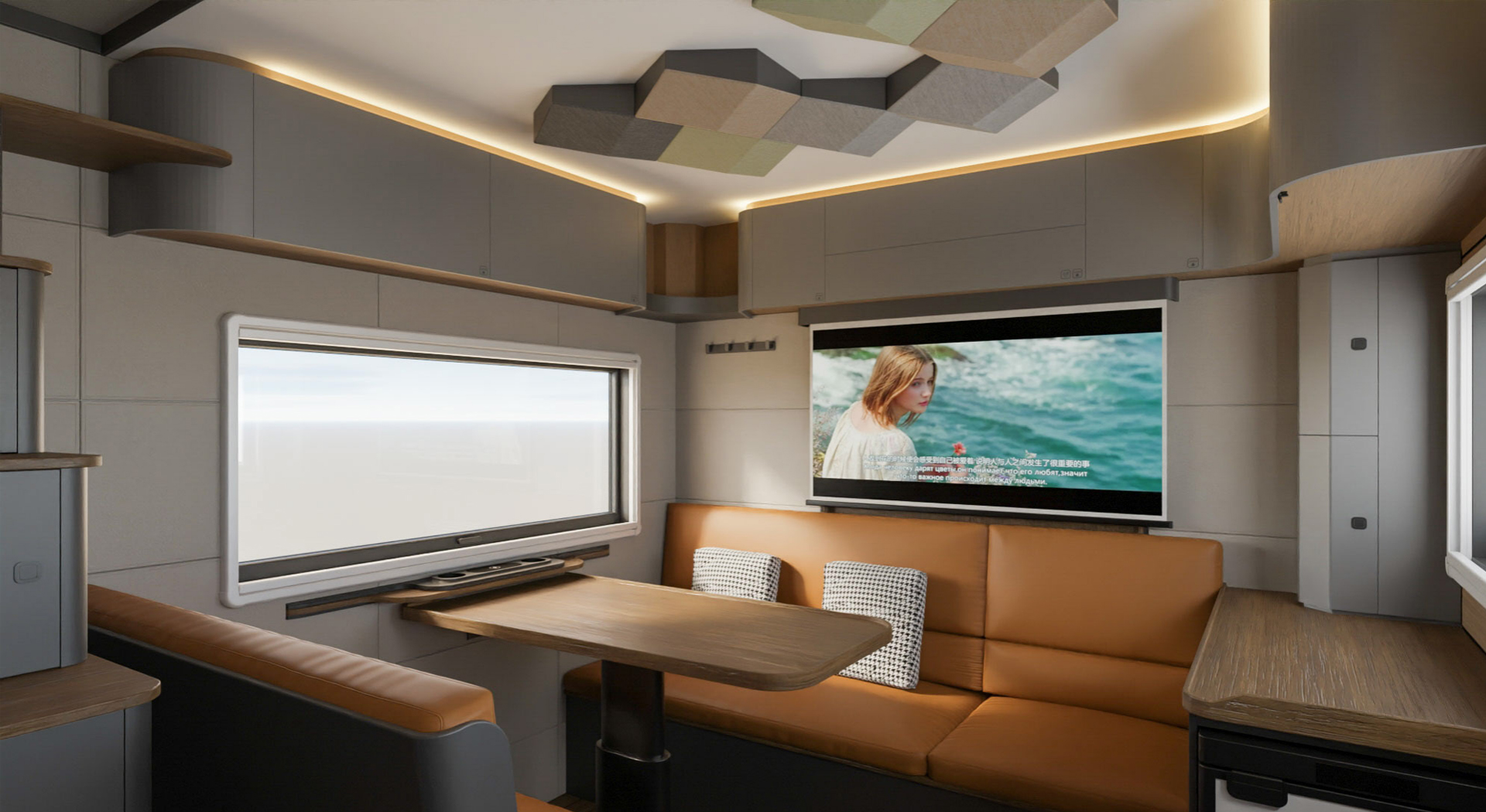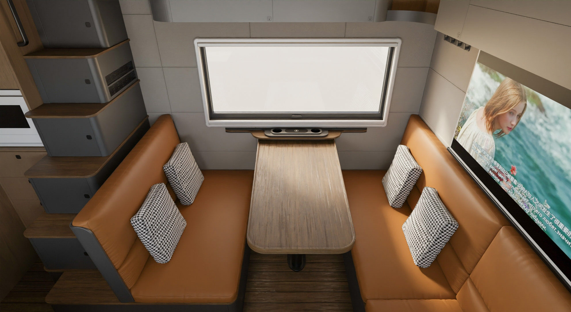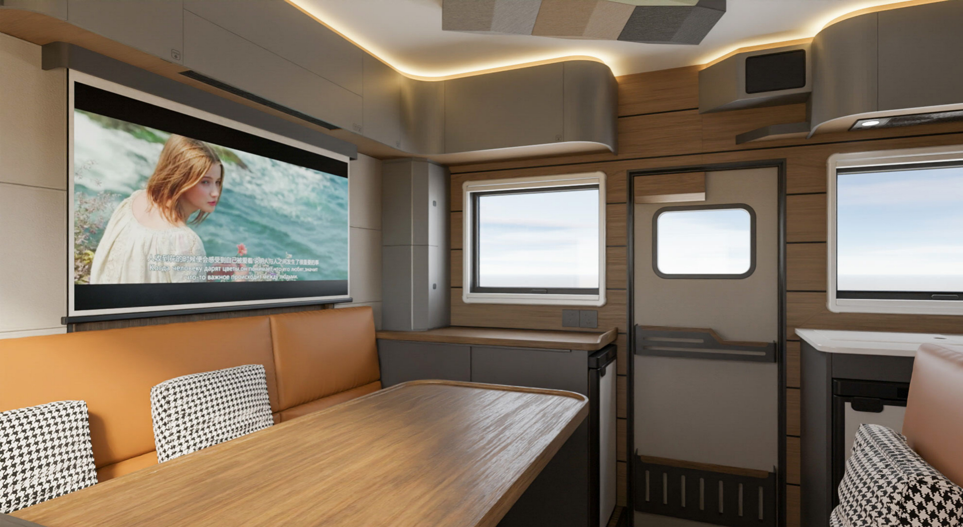 房车的内部空间宽敞,布局合理,各种生活设施床、沙发、厨房厨具、卫生间等一应俱全,给人一种家的温馨感。