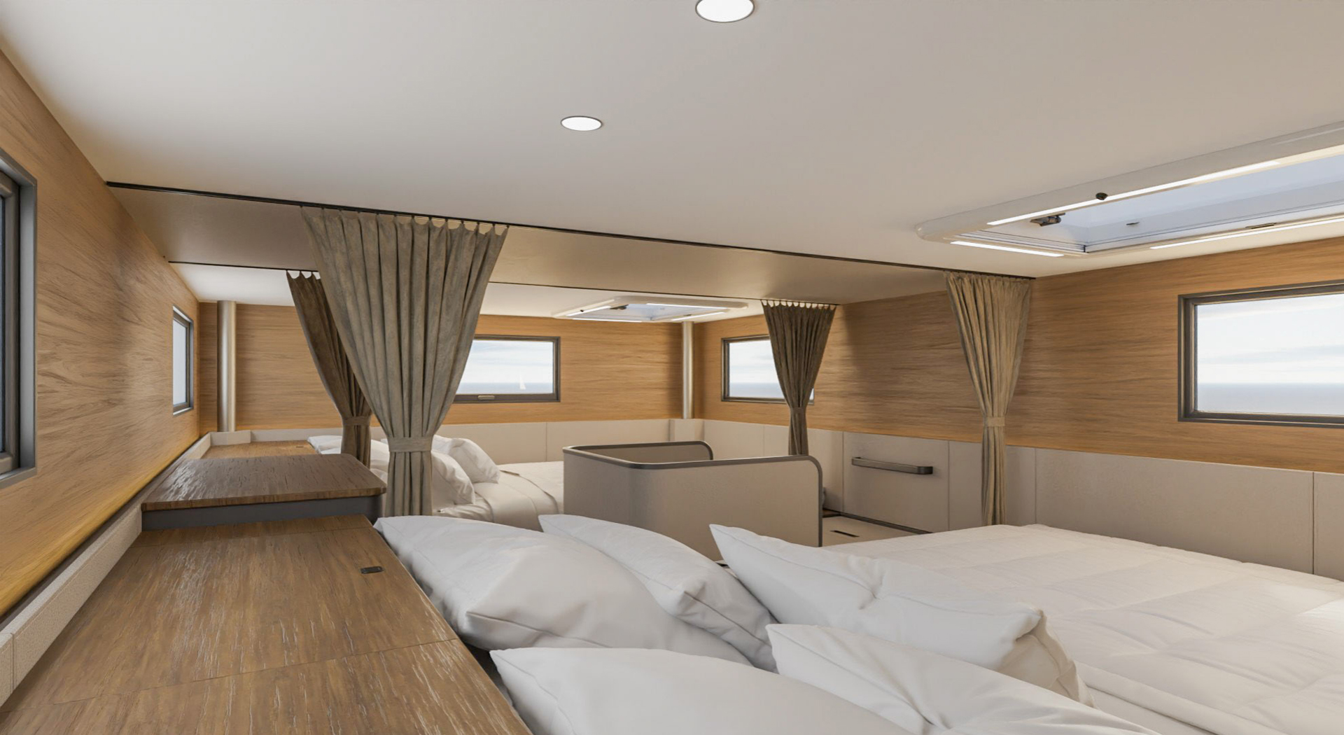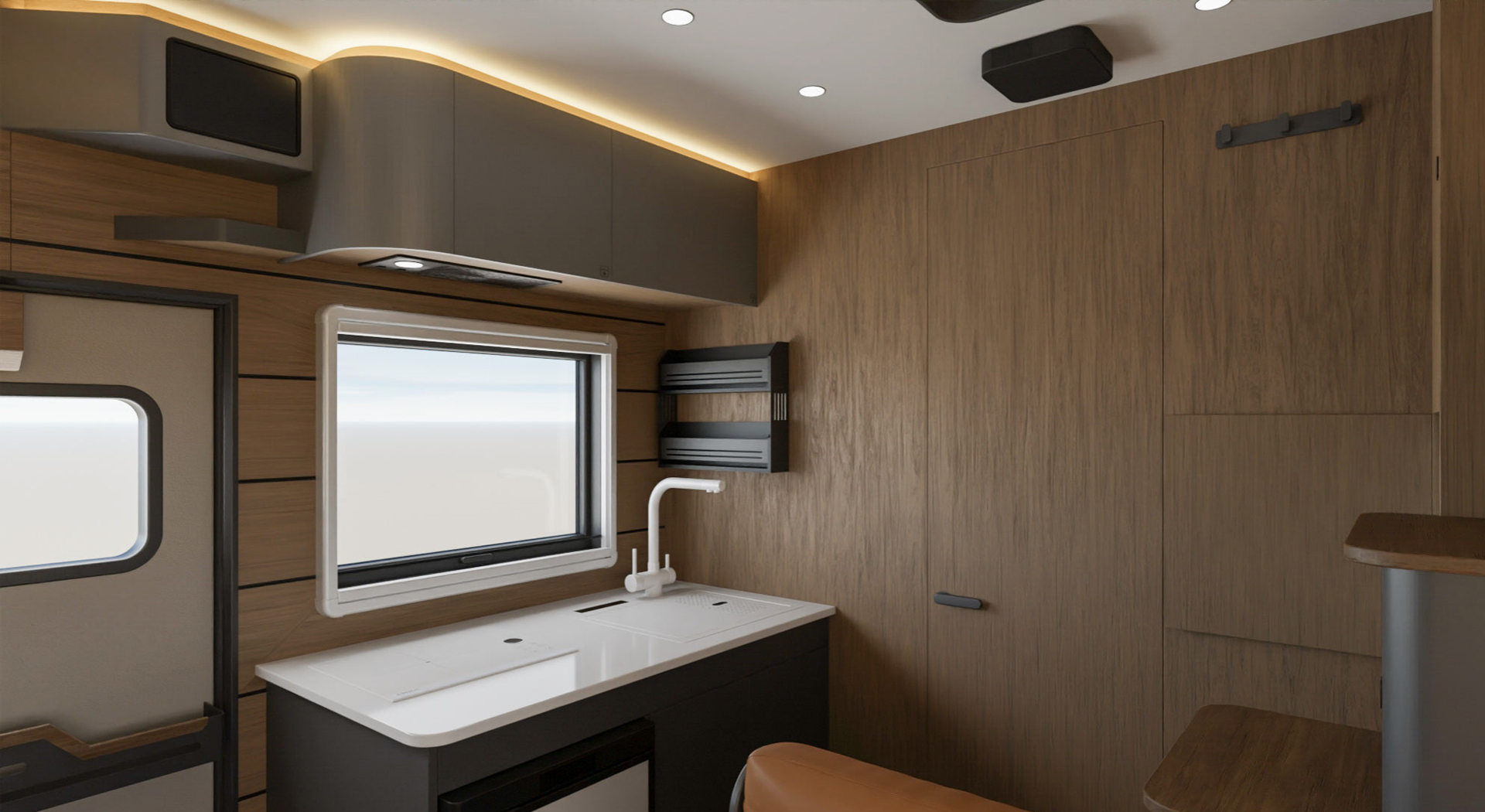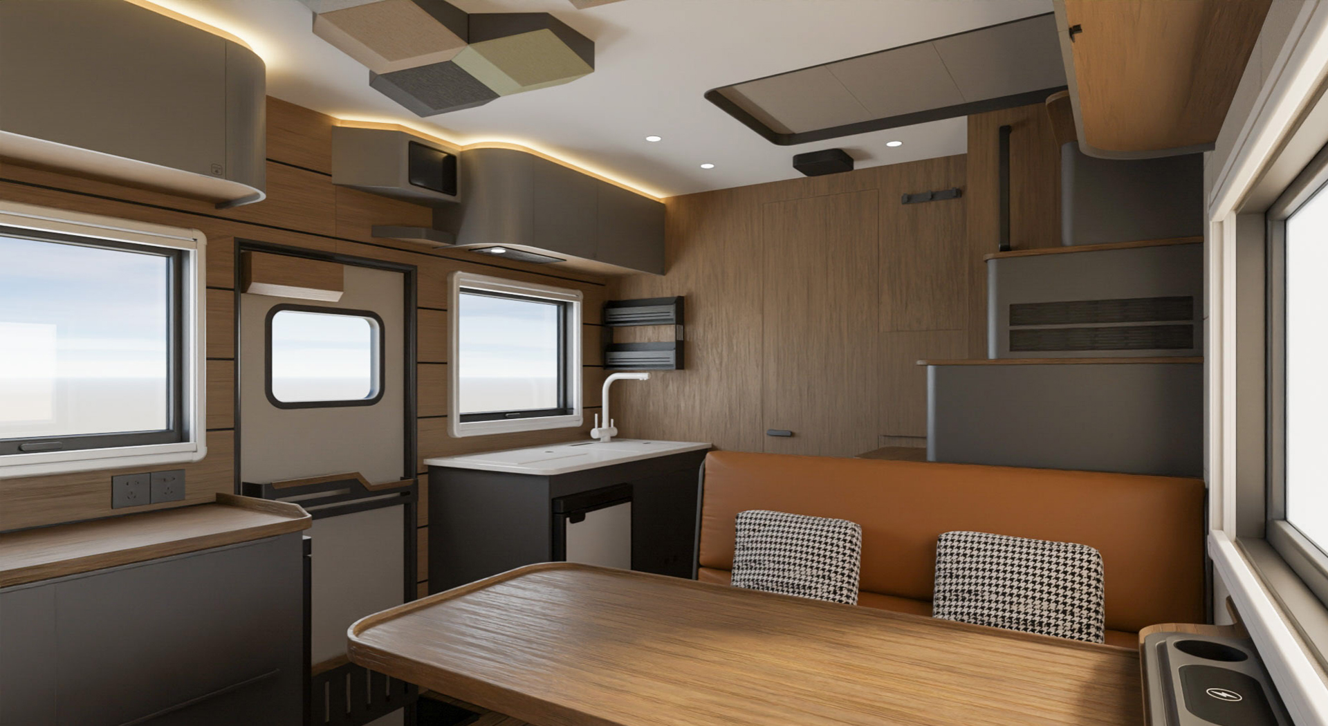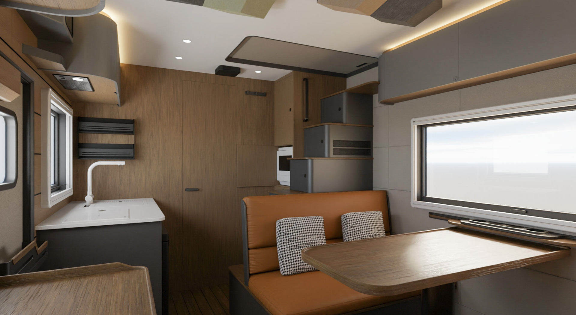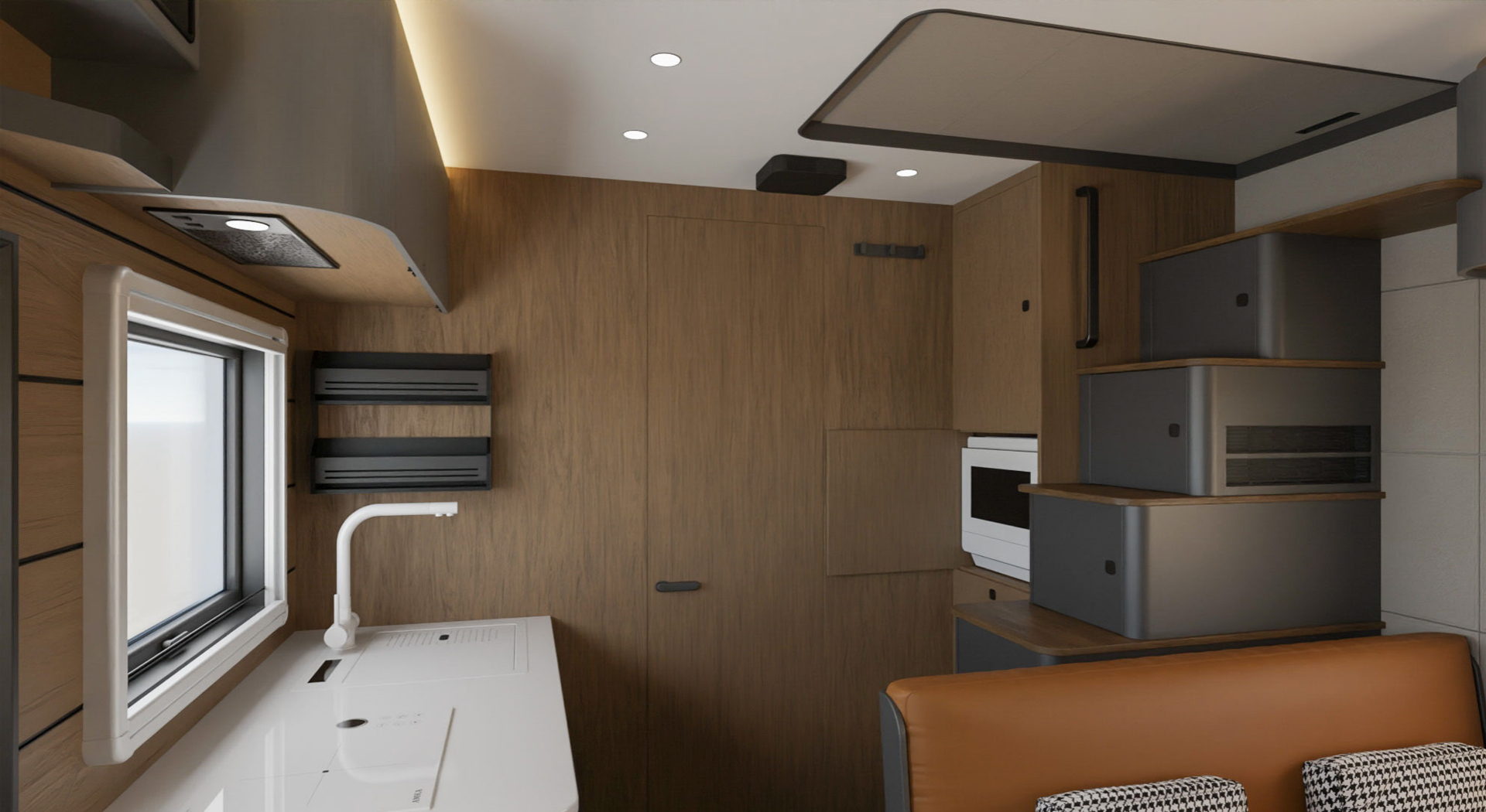 房车的内部空间宽敞,布局合理,各种生活设施床、沙发、厨房厨具、卫生间等一应俱全,给人一种家的温馨感。