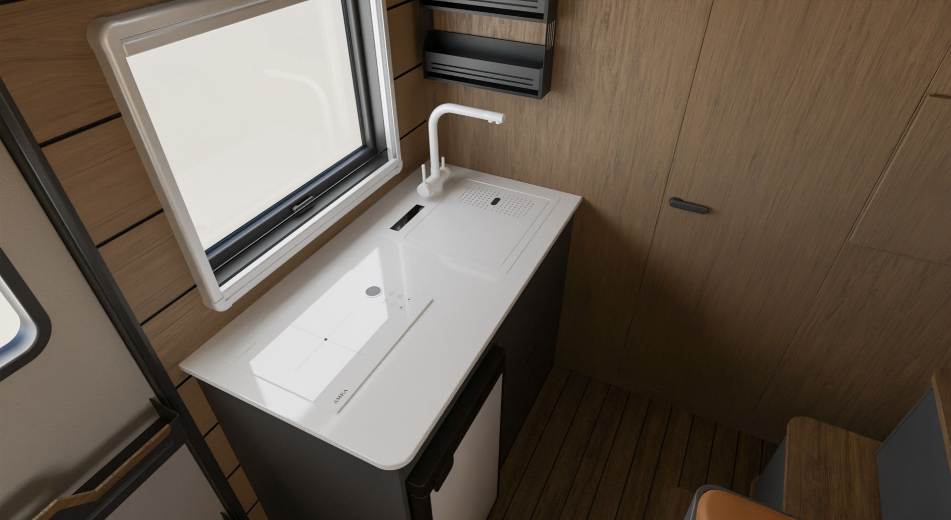 | 厨房系统 | ■ 英得尔房车专用进口冰箱 76L 两个 ■咖啡机 ■Amka TS-22C01B电磁炉 ■ 洗菜盆 九牧 ■进口多美达房车专用油烟机 ■Fotile/方太 蒸烤一体 |