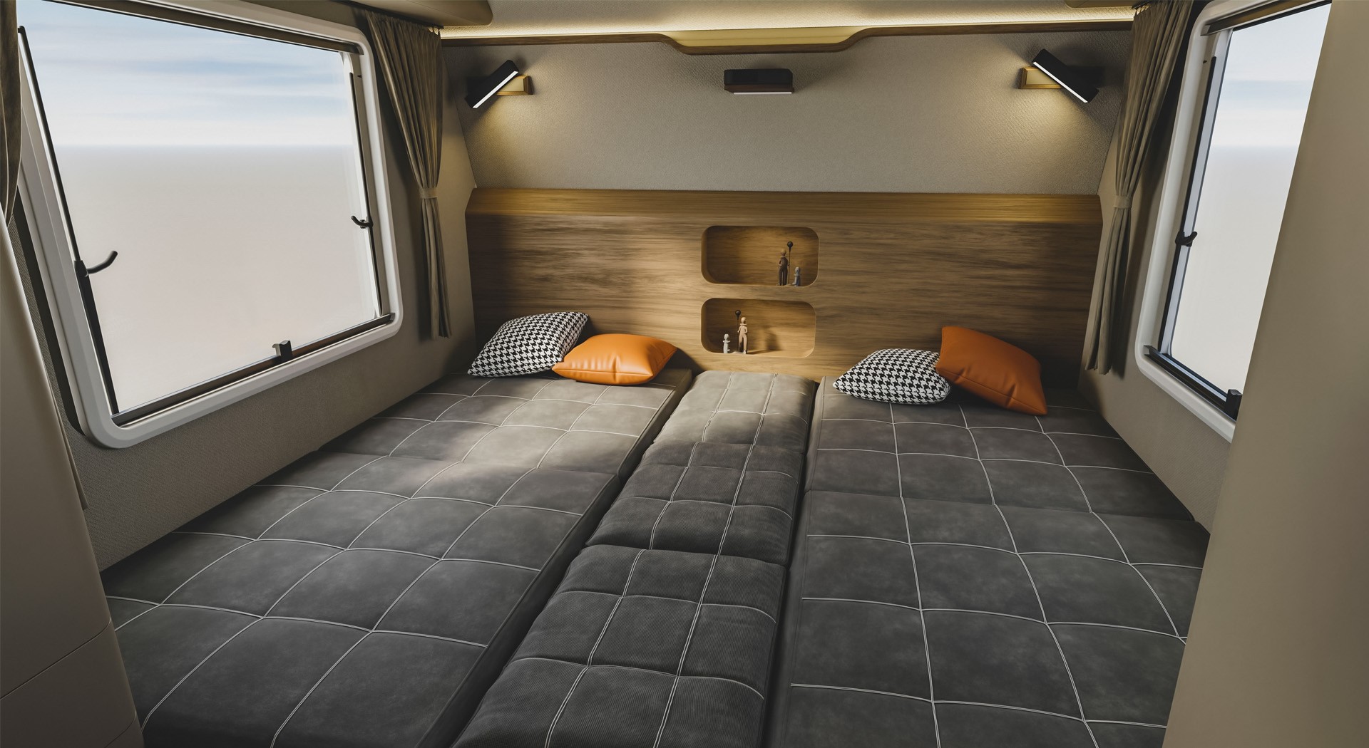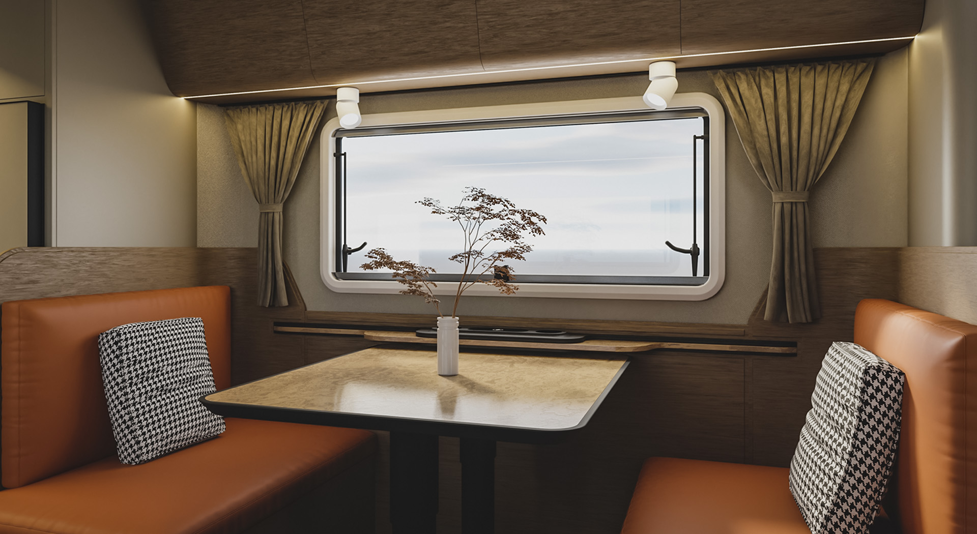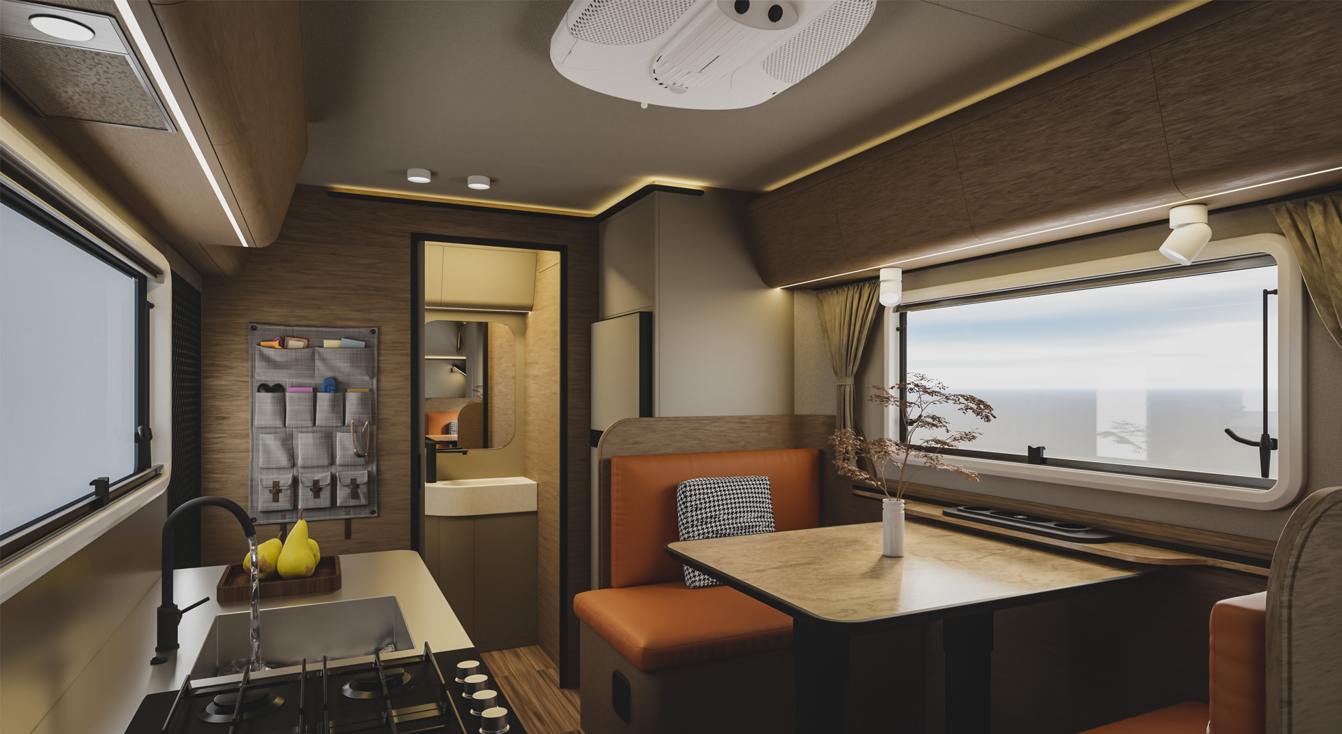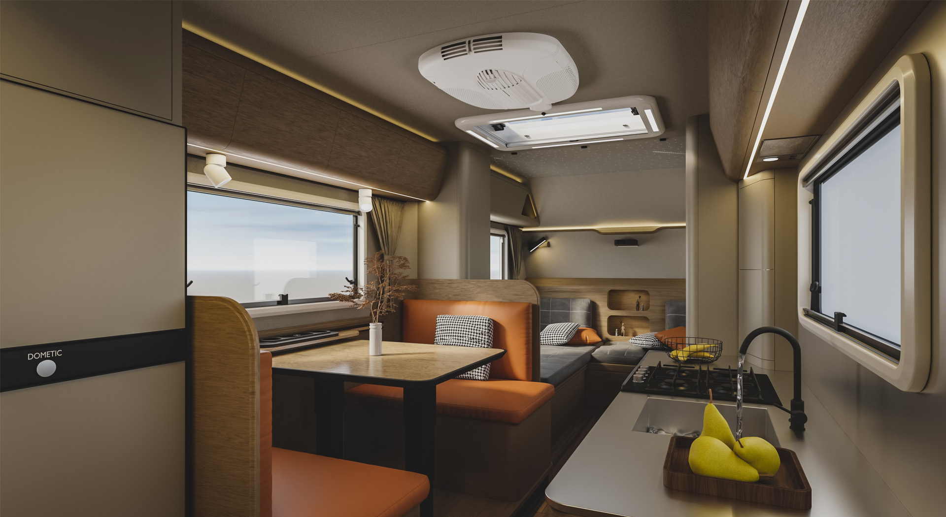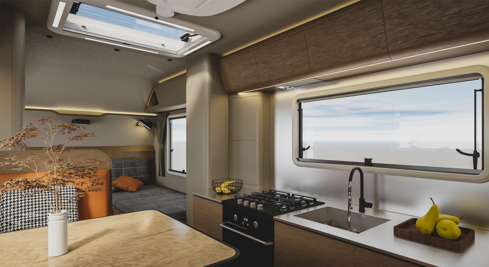房车的内部空间宽敞,布局合理,各种生活设施床、沙发、厨房厨具、卫生间等一应俱全,给人一种家的温馨感。