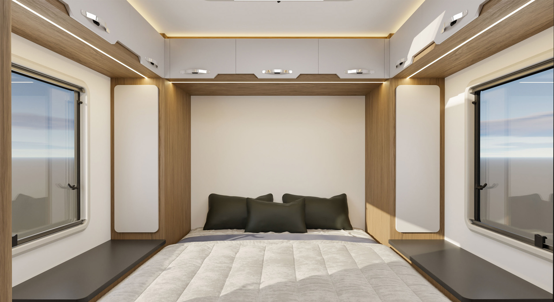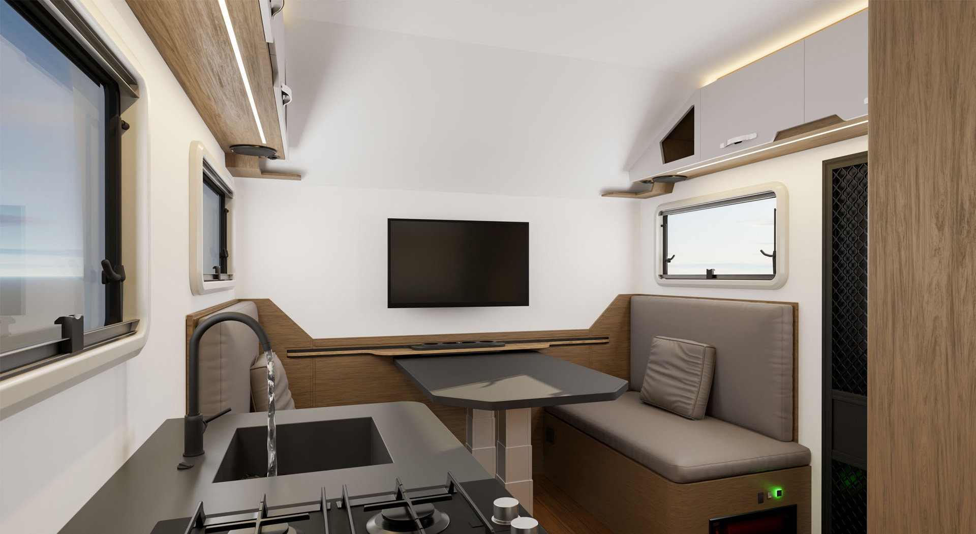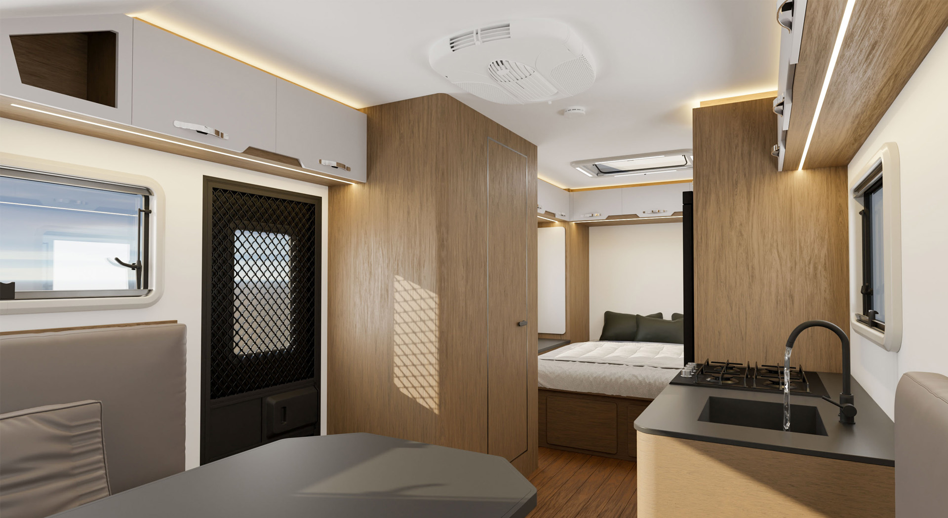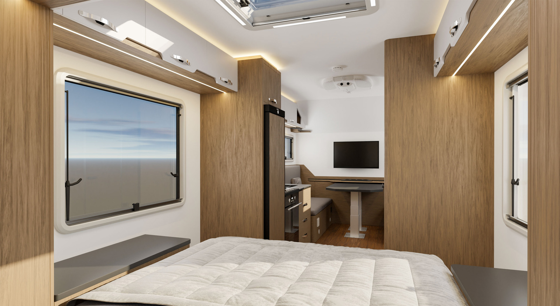 房车的内部空间宽敞,布局合理,各种生活设施床、沙发、厨房厨具、卫生间等一应俱全,给人一种家的温馨感。