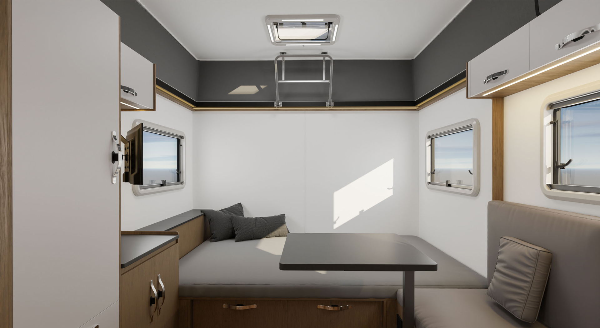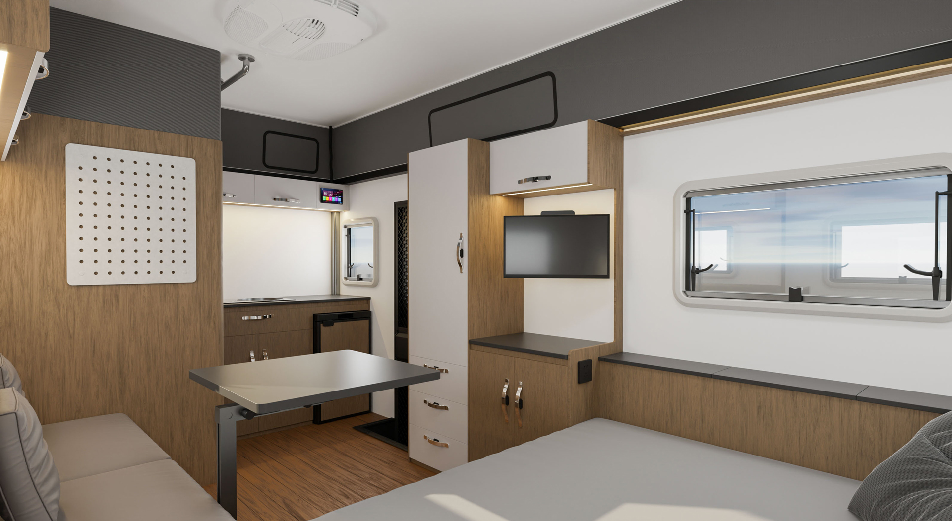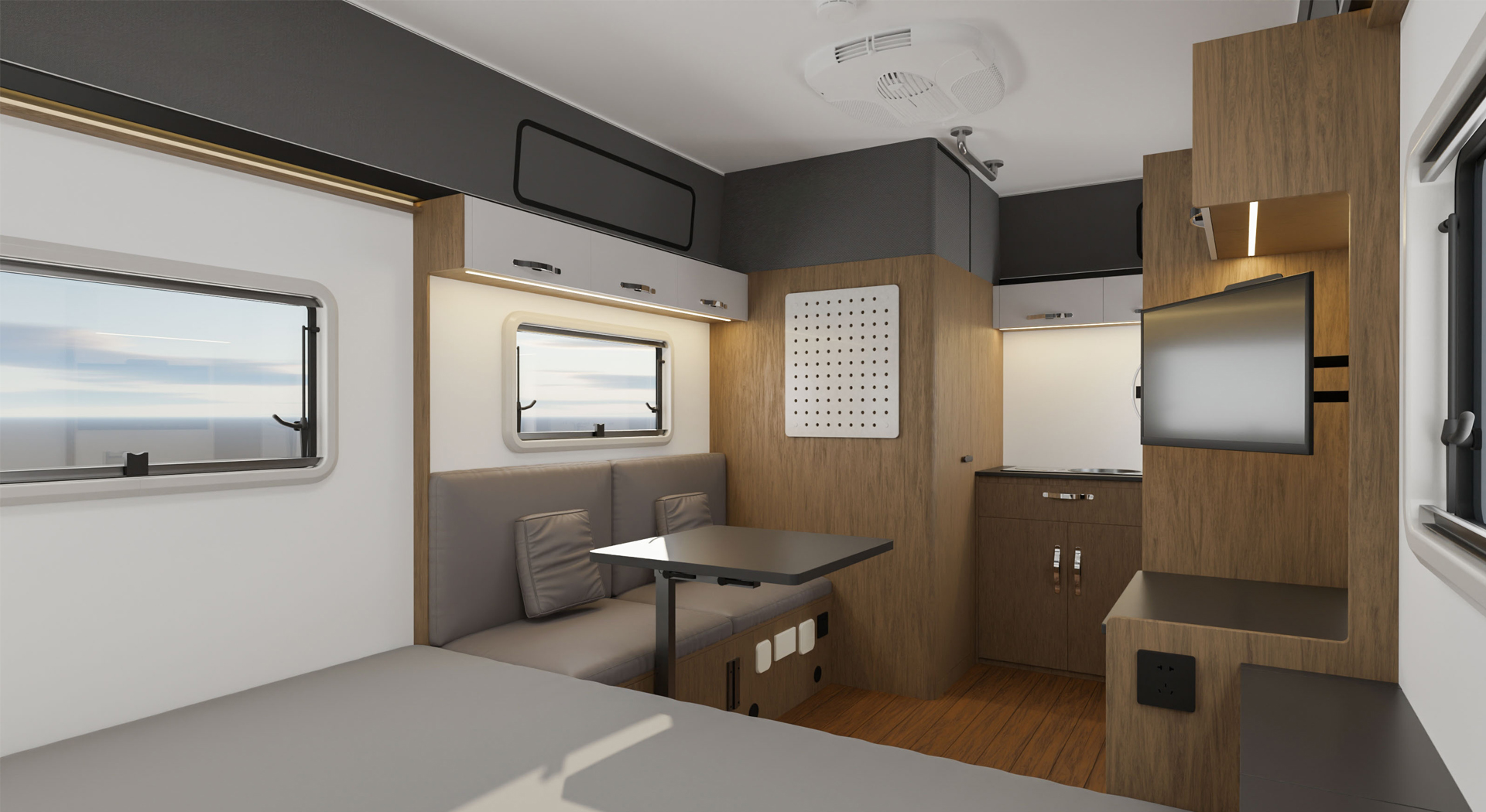 房车的内部空间宽敞,布局合理,各种生活设施床、沙发、厨房厨具、卫生间等一应俱全,给人一种家的温馨感。