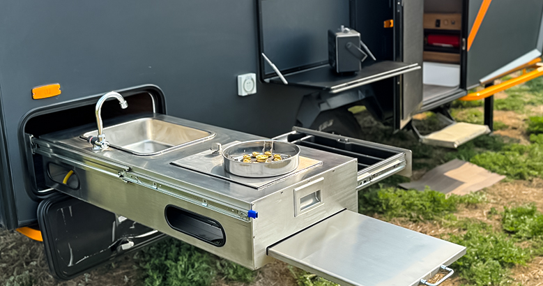 配备储物箱、抽拉式厨房、遮阳棚、室外花洒、吧台、220V取电口、兵工铲等等