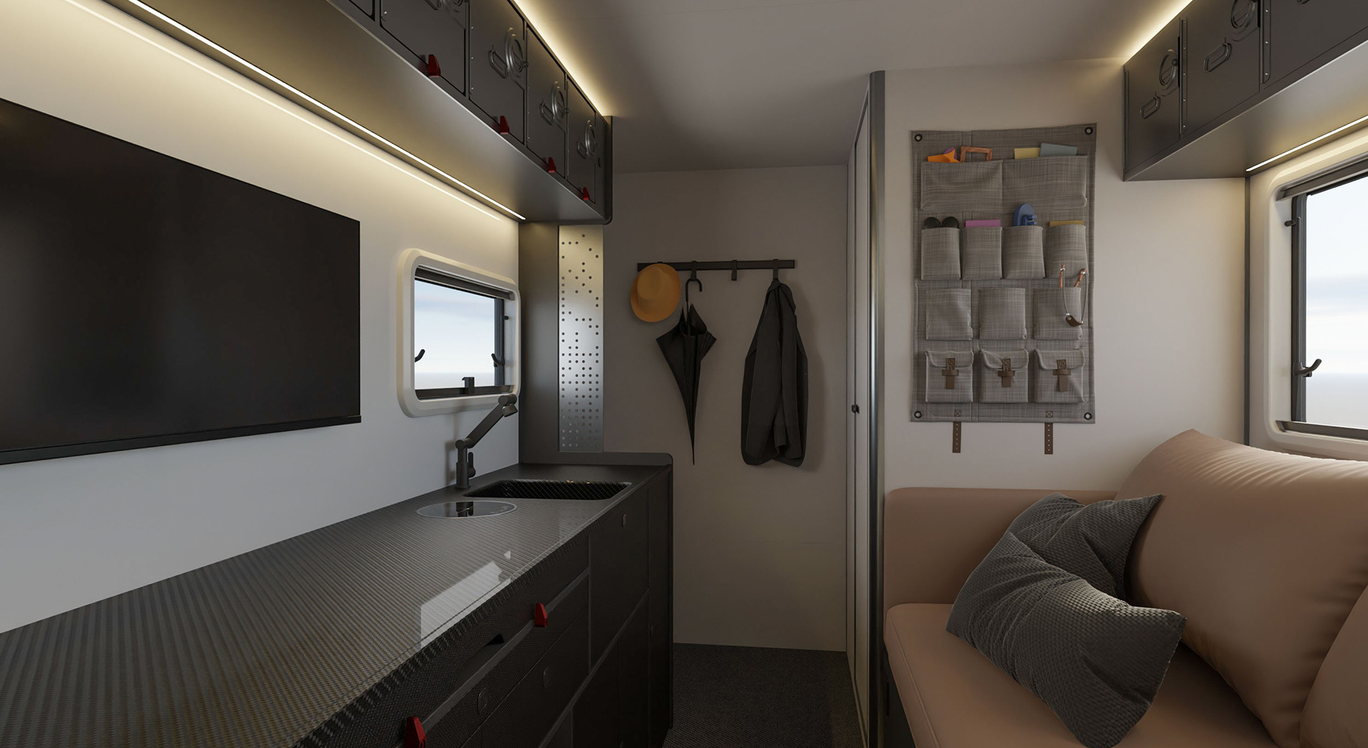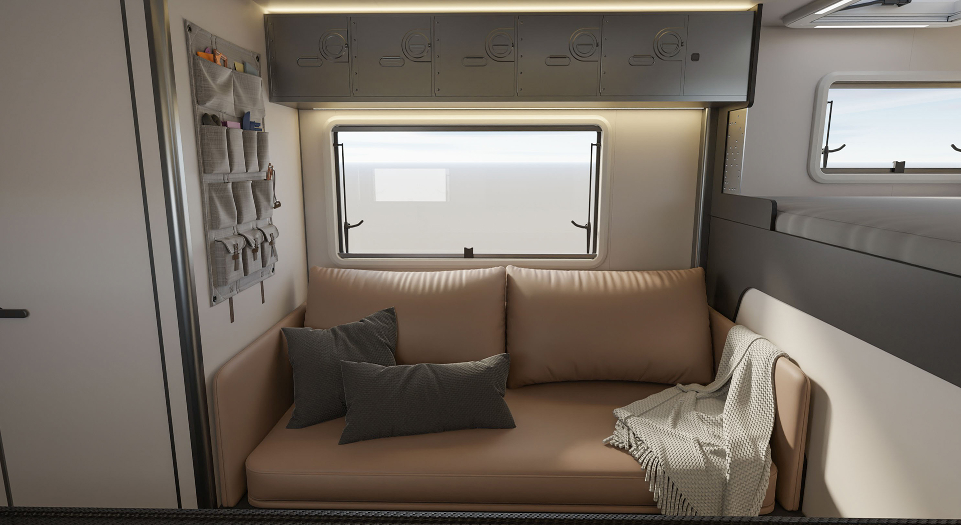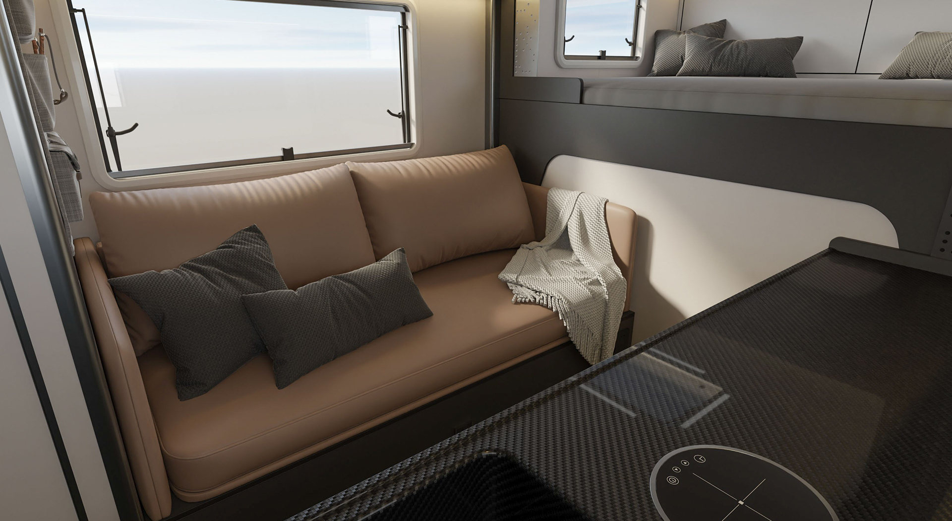 房车的内部空间宽敞,布局合理,各种生活设施床、沙发、厨房厨具、卫生间等一应俱全,给人一种家的温馨感。