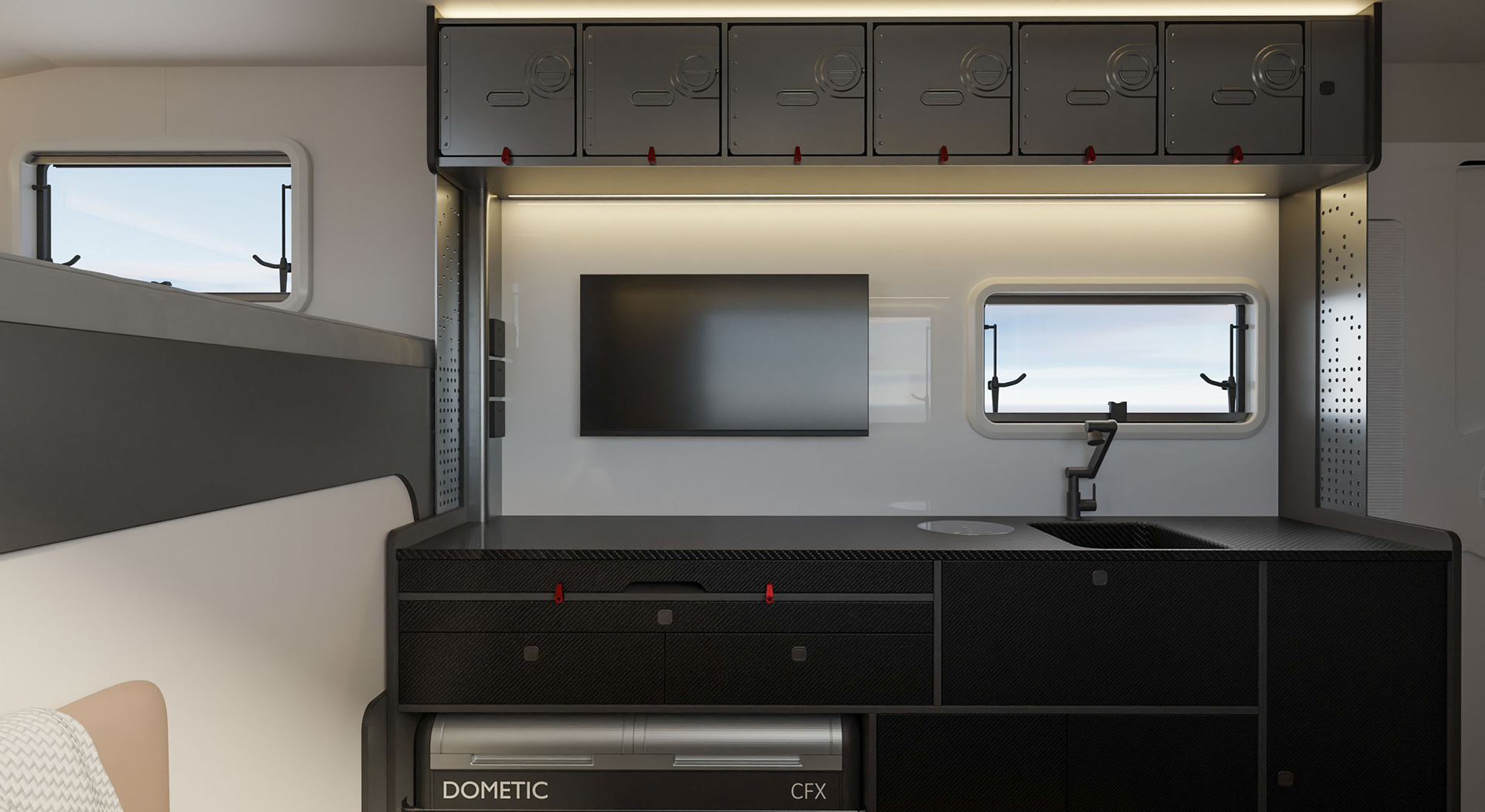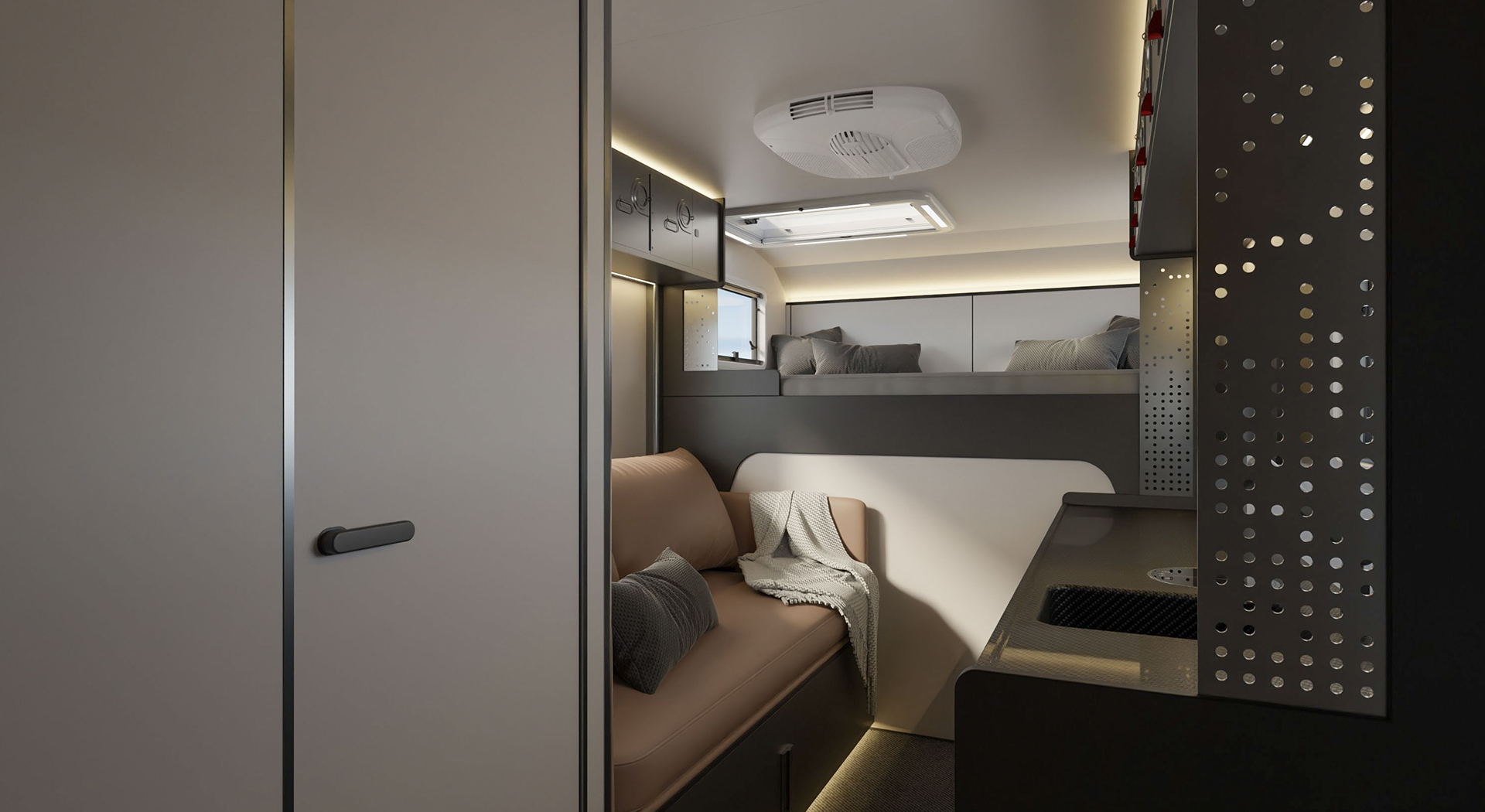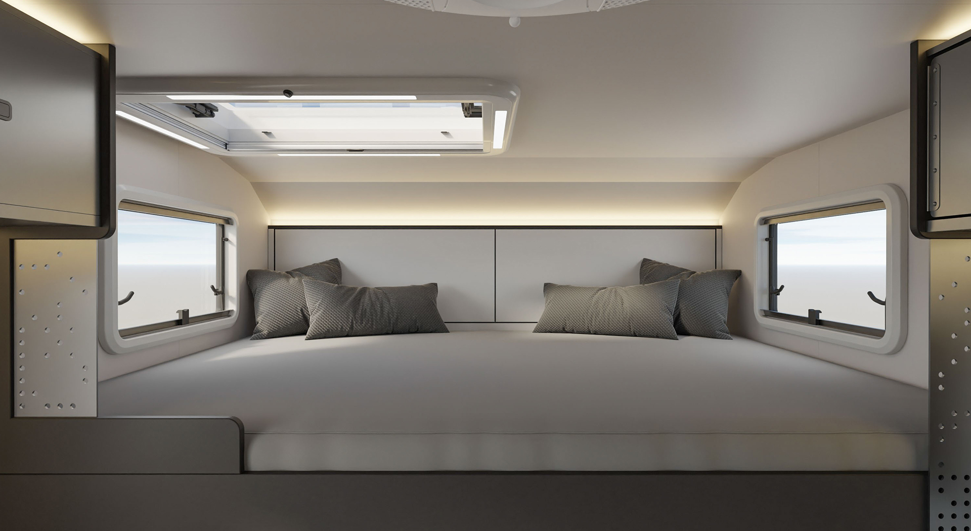 房车的内部空间宽敞,布局合理,各种生活设施床、沙发、厨房厨具、卫生间等一应俱全,给人一种家的温馨感。